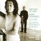 ◎モーツァルト ヴァイオリン・ソナタ第33番 ヘ長調 K377 第27番 ハ長調 K303 第28番 ホ短調 K304 第42番 イ長調 K526 マーク・スタインバーグ(ヴァイオリン), 内田光子(ピアノ) <2004.6.28-7.1> 蘭PHILIPS 475 6200 (SACD Hybrid) モーツァルトのピアノ協奏曲やピアノ・ソナタの全集録音も行っていた内田 光子の久々のモーツァルト録音です。ブレンターノ弦楽四重奏団の第1ヴァイ オリン奏者でもあるマーク・スタインバーグとはマールボロ音楽祭で出会い, 1992年から共演を重ねており,2001年にはこのデュでモーツァルトの ヴァイオリン・ソナタの全曲演奏会も行い,以後,各地で共演を重ねており, この録音は正に満を持して行われたものです。 私が聴いたのは輸入盤のSACDハイブリッド盤ですが,CDは国内盤でし か発売されないとのことです。国内盤CDは税込み2548円ですが,輸入盤 のSACDハイブリッド盤は大手CDショップなどではスペシャルプライスで 売られているところであり,私も税込み2490円で入手できました。 さっそく聴いてみると,内田光子のピアノは落ち着いた表現を基調としつつ も,細部に至るまで検討し尽くされた大変に精妙かつバラエティに富んだ演奏 を聴かせており,さらには静かな感興にも満たされていて,聴いていて確かな 手応えと愉悦感を感じさせてくれる大変見事な演奏です。 そして,内田光子のピアノ以上に聴いて驚いたのはスタインバーグのヴァイ オリン演奏の見事さで,使用している楽器は不明ですし,その音色も決して名 器の響きとはいいがたいのは事実ですが,楽器の魅力に過度に頼らない演奏を 行っているといえると思います。 そして肝心の演奏内容はというと,聴き始めた途端に,その精妙な音のコン トロールと,ややクールで聡明さを感じるフレージングの見事さに驚嘆してし まいましたし,デュオとしての呼吸も絶妙で,それぞれがしっかりと自分の演 奏を行いつつも,双方の個性がぶつかることはなく,価値観を共有し同じ方向 を向いた達意の域にある演奏ではないかと思います。 音質については,SACDの方は楽器の音色や演奏の細やかな表情を見事に 再現しており,この演奏がどのようなものであるかを克明に聴き取ることがで きますが,CDの方になると比較してのこととはいえ,音のニュアンスの情報 量に遜色があるのは否めず,特徴を感じにくい,やや素っ気ない演奏に聴こえ てしまうのも事実です。 そんなわけで,これは私も聴く前には想像も出来なかった練達の演奏を聴く ことができ,作品の魅力を再認識させられる思いでしたし,まさに当代最高の デュオの妙味を堪能できる1枚として強力に推薦したいと思います。