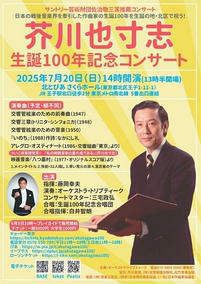 藤岡幸夫指揮、オーケストラ・トリプティークの“芥川也寸志生誕100年記念コンサート”昨年は芥川也寸志(1925-1989)の生誕100年であり、昨年7月20日には、北とぴあ さくらホールにおいて、藤岡幸夫指揮のオーケストラ・トリプティークにより、芥川也寸志 生誕100年記念コンサートが行われ、そのライヴ録音が発売になりました。さらに、遺作となった、1988年作曲のいのちが演奏されており、これは、なかにし礼の作詞による、合唱と管弦楽のための作品で、本門佛立宗の開導百遠諱のために作曲されたのですが、完成させることができず、芥川也寸志からの生前の依頼により鈴木行一がオーケストレーションを完成させた作品です。 映画音楽「八つ墓村」は、芥川也寸志自身が「自分の映画音楽における総決算」と述べていたところで、作曲だけでなく、自ら指揮もしていました。今回演奏されているのは、サウンドトラックの自筆譜から西行一が組曲に構成したものです。 また、絃楽のためのトリプティークは100年記念コンサートではなく、2021年9月16日に渋谷区文化総合センター大和田 さくらホールで行われた演奏会のライヴ録音が収録されており、管弦楽曲集としての網羅性を図っています。 藤岡幸夫は日本人作品の演奏にも熱心であり、先月23日のこの欄で、東京シティ・フィルを指揮しての交響頌偈「釋迦」と交響曲「仏陀」を収録したCDを紹介したばかりです。オーケストラ・トリプティークはそもそも日本の作曲家の演奏を専門とするオーケストラであり、両者によってこのような演奏会が企画実施されたことは、非常に意義深く、そのライヴ録音CDが発売されたことは非常に嬉しく、あとは楽しみに聴かせてもらおうと思っています。