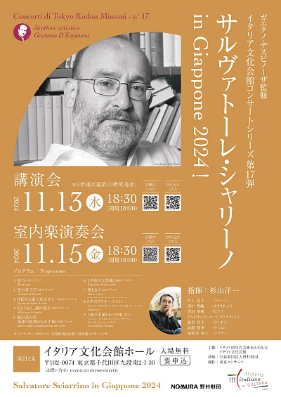 “イタリア文化会館コンサートシリーズ第17弾 サルヴァトーレ・シャリーノ室内楽演奏会”のライヴ録音イタリアの作曲家、サルヴァトーレ・シャリーノ(Salvatore Sciarrino, 1947-)は、前衛的な作品とは異なった、極度に繊細で、演奏技法や、聴き手の感覚の限界に迫るような趣の作品を作曲しており、現代音楽の作曲家の中にあっても、世界的に人気があって、演奏頻度の高い1人です。シャリーノは2024年に“Salvatore Sciarrino in Giappone 2024”というプロジェクトのために来日し、イタリア文化会館でワークショップを開催し、東京藝術大学、東京音楽大学、桐朋学園大学、国立音楽大学、愛知県立芸術大学、京都市立芸術大学から選抜された、作曲科と演奏科の学生達に精力的な指導を行いました。 イタリア文化会館では、指揮者のガエタノ・デスピノーザの監修により“イタリア文化会館コンサートシリーズ”を継続開催しているのですが、2024年11月13日の講演会に続き、15日には、イタリア文化会館コンサートシリーズ第17弾 サルヴァトーレ・シャリーノ室内楽演奏会が開催されました。 この演奏会のライヴ録音CDが、ドイツの現代音楽専門のレーベルであるNEOSから発売になりました。ブックレットには日本語解説も記載されています。このレーベルは、日本国内で行われたクセナキス、一柳慧、杉山洋一の作品のライヴ録音CDも発売していたところで、ドイツのレーベルでありながら日本での現代音楽の演奏会にまで目配せしているということには驚くほかありませんが、シャリーノの様々な作風の作品を聴くことのできる充実した演奏会であり、風もなくと、1通の手紙と6つの唄の2曲はこのライヴ録音が世界初録音ということであり、これは非常に意義深くて貴重な録音のリリースとなったものであり、あとは楽しみに聴かせてもらおうと思っています。